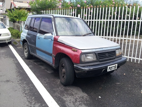Sá þessa skemmtilega flekkóttu súkku á eyjunni Dóminíku í Karíbahafinu. Þeir eru miklir Súkkuáhugamenn. Erfitt að segja hvað þetta samansafn er úr mörgum bílum.