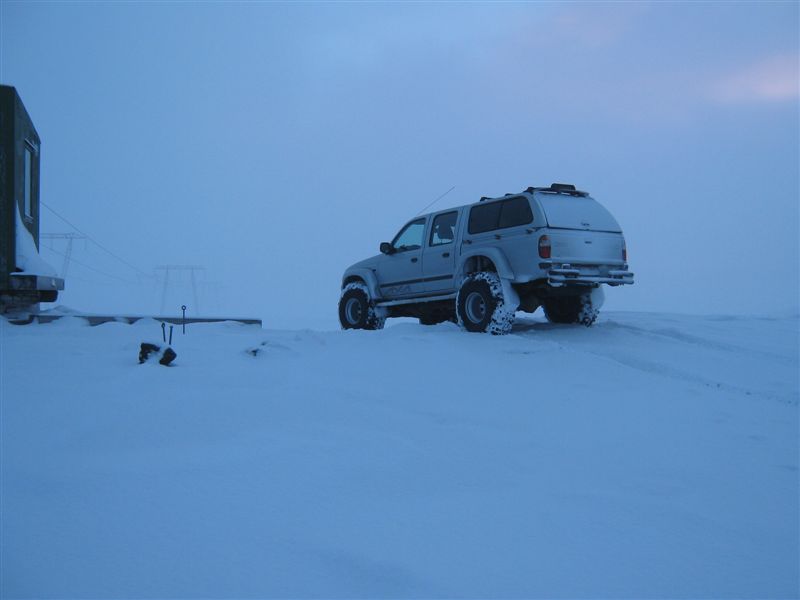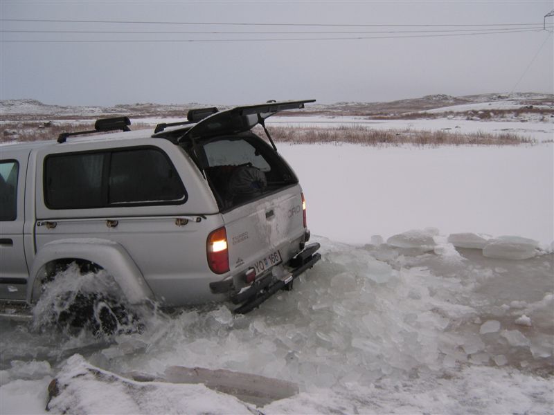 Fór línuveginn um helgina. Ekki alslæmt. Austur af Þórólfsfelli var smá snjór og fór ég í fimm pund á kafla. Klaki var á eystri ál Tungufljóts og varasamt. Áin hafði bólgnað mikið og væri upp á mælaborð ef bíll myndi brotna niður ef farið væri beint yfir hefðbunda vaðið. Reyndi að fara hálfhring umhverfis bólgna hlutann þar sem grynnst var á en pompaði niður og lenti í tæplega þriggja tíma basli að berja og brjóta niður og vesenast áður en bíllinn fór upp.