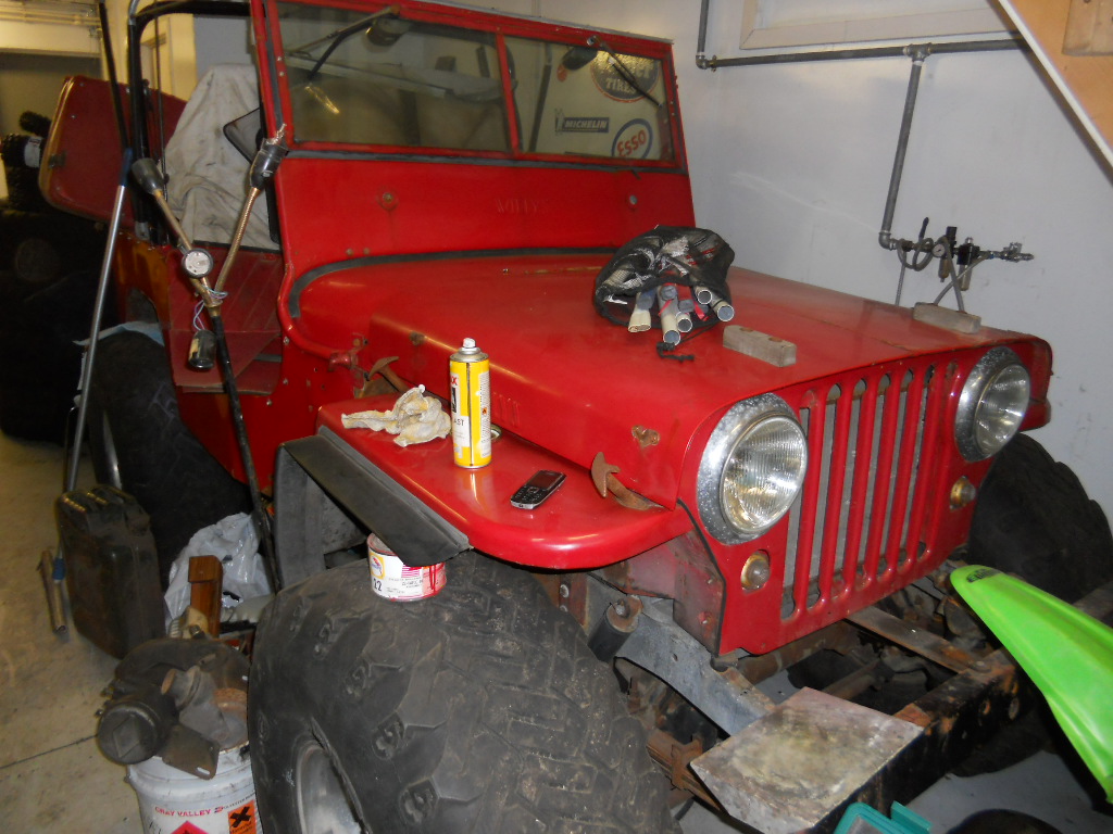 willys 46 ,,, ég fekk nokkra hluti i jeppan i dag svo það stittist i að hægt sé að fara að huga að hvað er best að gera úr honum ,,, fekk fram brettin húddið og afturkanta úr plasti ,, i 38" breiddini 350chevy 4 bolta blokk fyrir 383 stroke ,, og 350akiptingu ,,, og 360amc með kúplingu ,en vantar kassan aftan á það ,, en helst vil eg 3 gira jeep kassan ur jeep og cherokee ,og 20kassan ,,, nú eg fekk lika 350buick og sjalfsk og keðjukassa sem eg veit ekki hvað er svo þetta er að koma