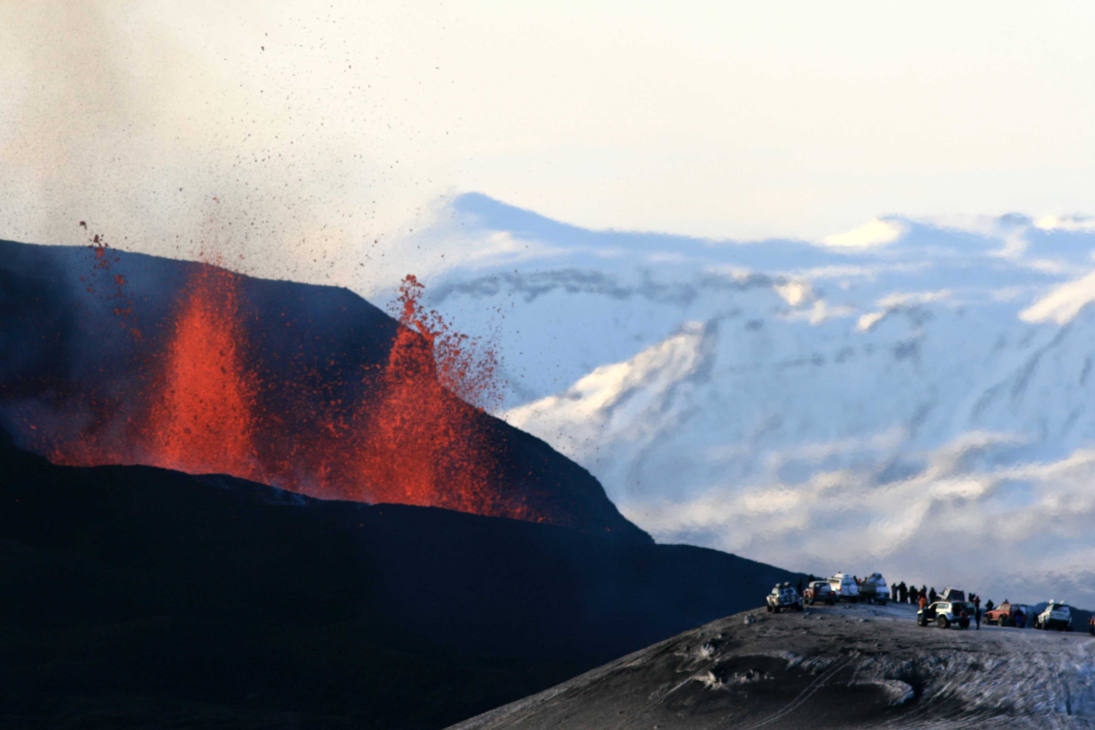 Á myndinni sést Wrangler Rubicon með eldsumbrotin á Fimmvörðuhálsi í baksýn. Myndin er tekin þann 4.4.2010 í froststillu.