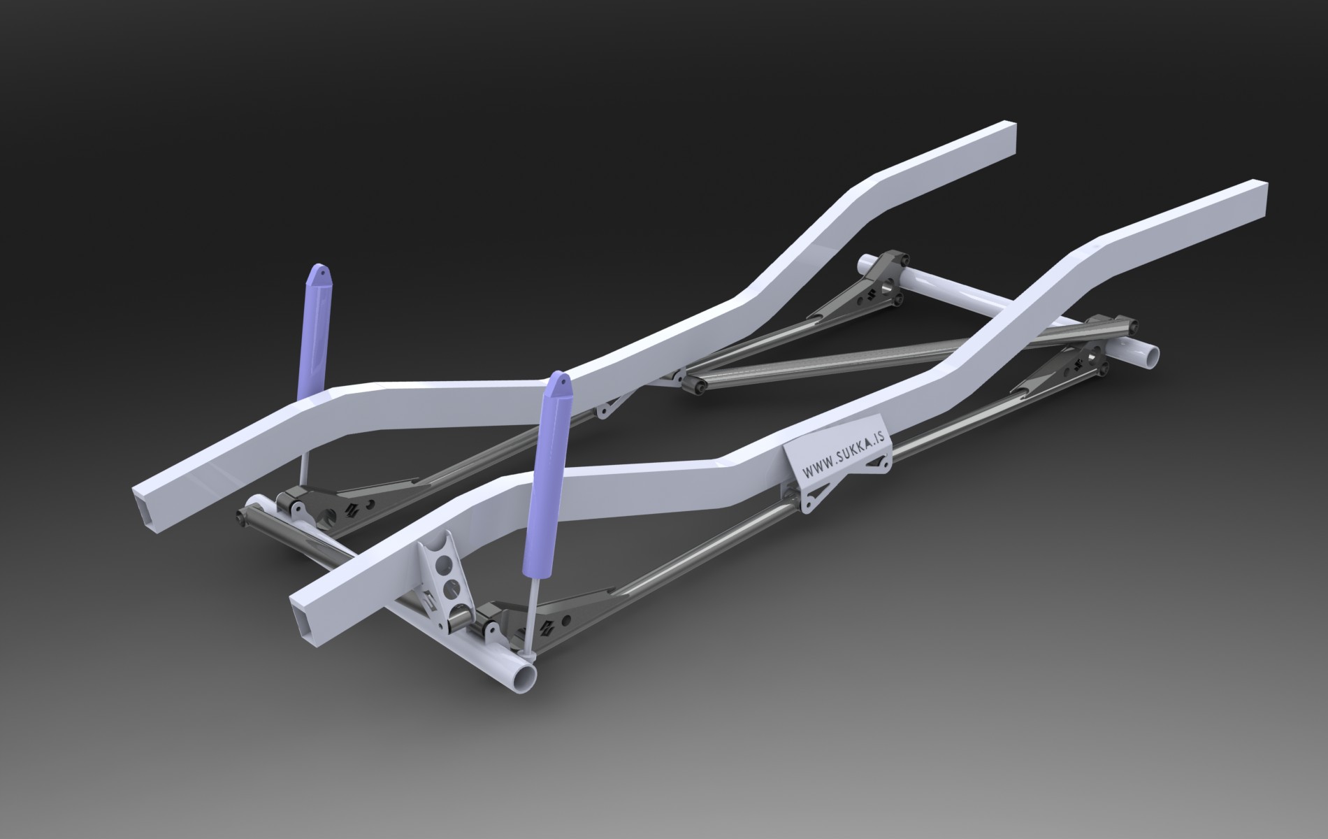 Stífusystemið að aftan var bara hugmynd til að reyna að fá fram fyrirferðarminni A-stífu, en það er ekkert víst að þetta sé neitt sniðugra. Mér finnst skástífur ljótar og leiðinlegar og vil ekki að hásingin færist til hliðanna. Helst vildi ég hafa A-stífu að framan líka og er með ákveðna hugmynd um hvernig hægt sé að gera það, án þess að bíllinn beygji við fjöðrun.
