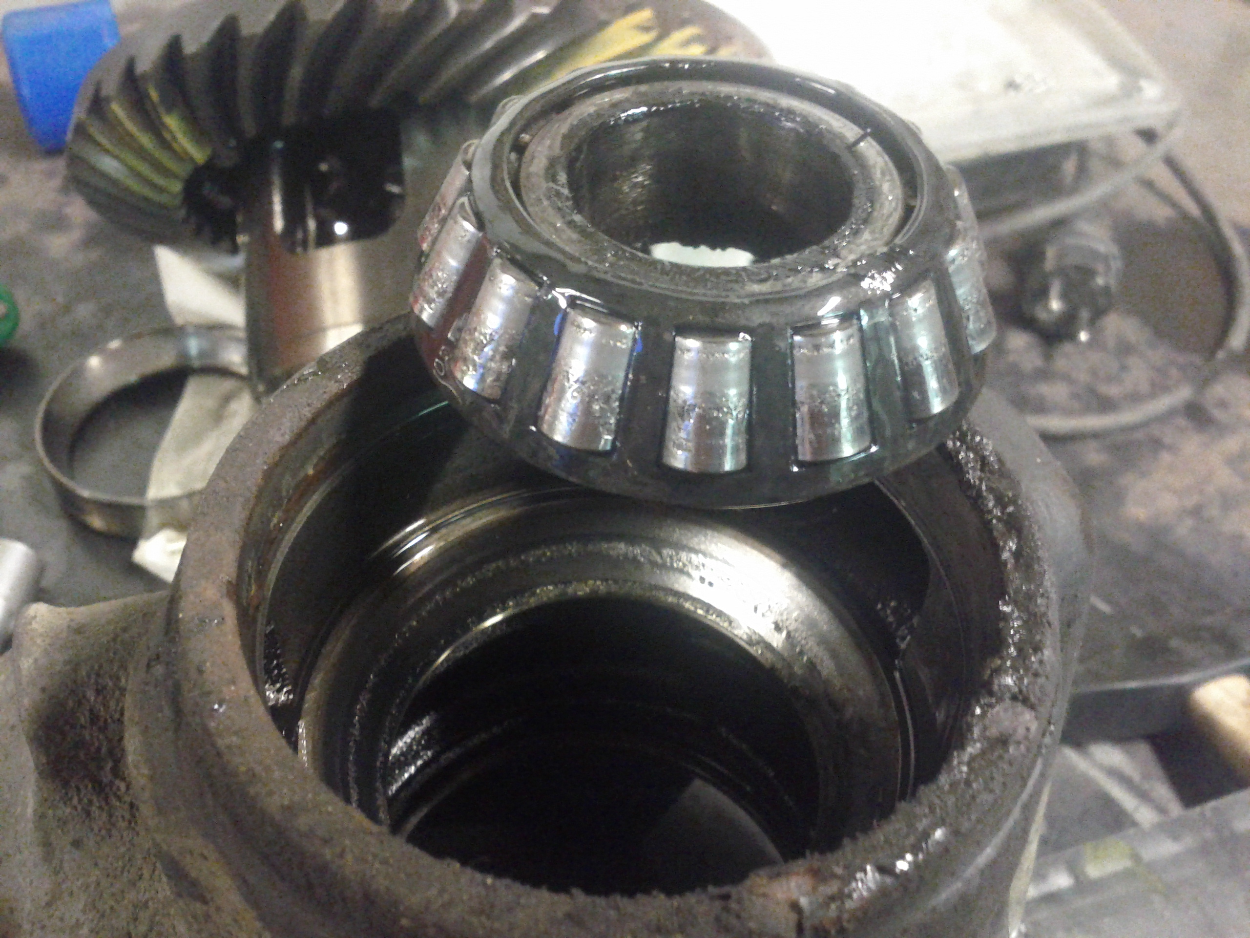 ef þú skiptir ekki um efri (stóru) pinion leguna þá þarftu svosem ekki að stilla hæðina á drifinu aftur, en ef þú ert með drif sem er með stilli-róm en ekki skinnudrif eins og er í 80 krúsernum mínum (rafmagnslæstur) þá þarftu að mæla bakslagið (backlash) -áður- en þú tekur drifið í sundur og helst gera svokallað pattern-check til að sjá hvort þú hafir sett rétt saman þegar þú gerir pattern-checkið aftur.