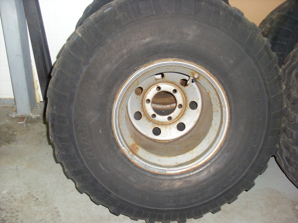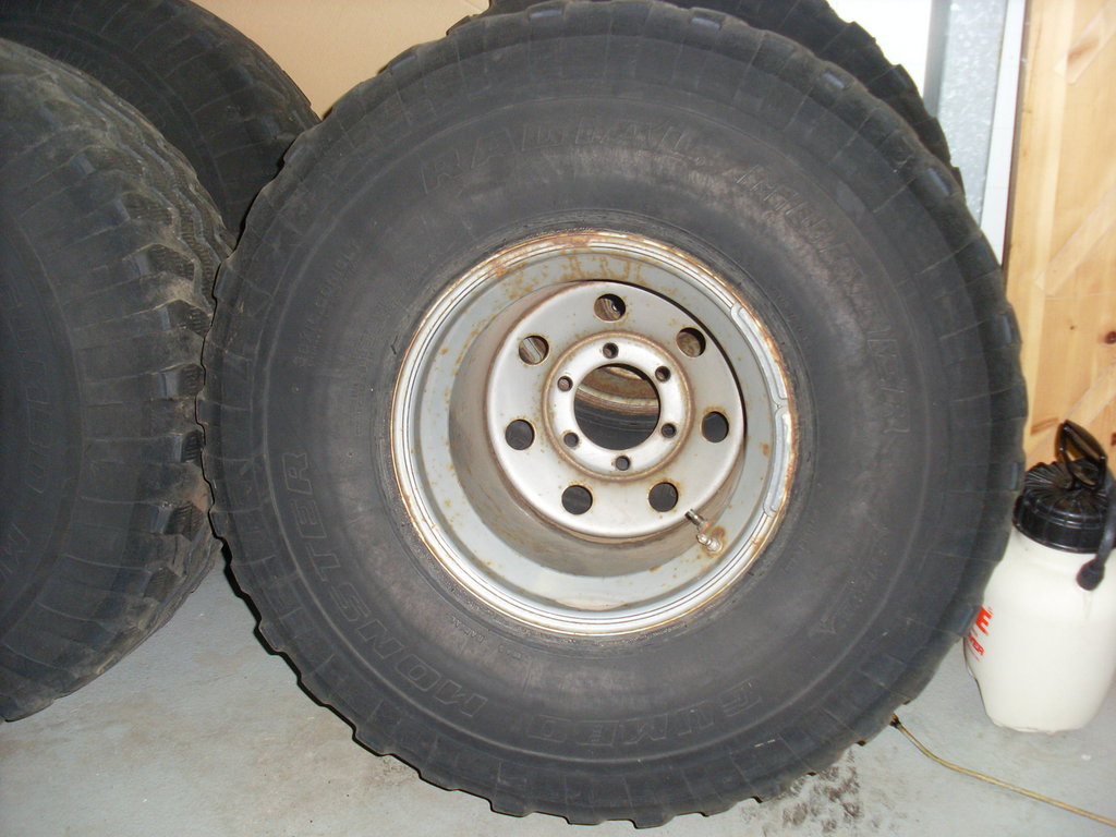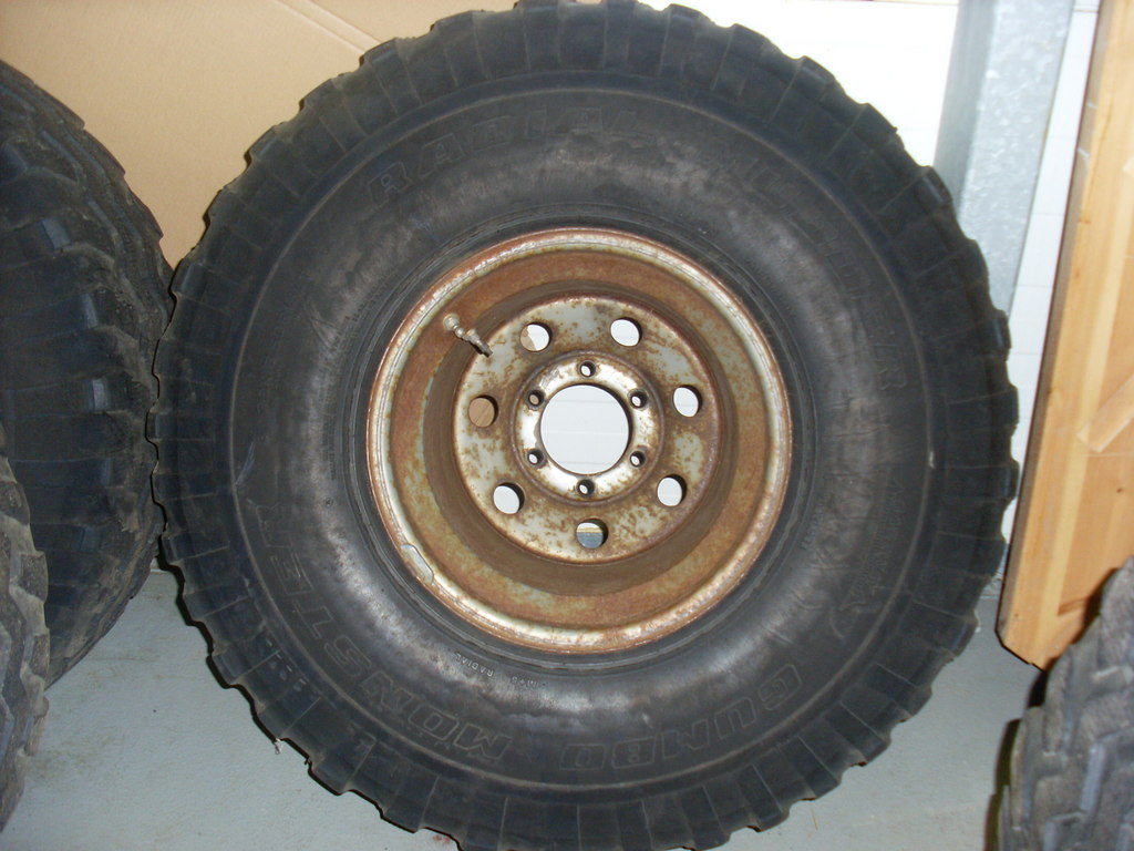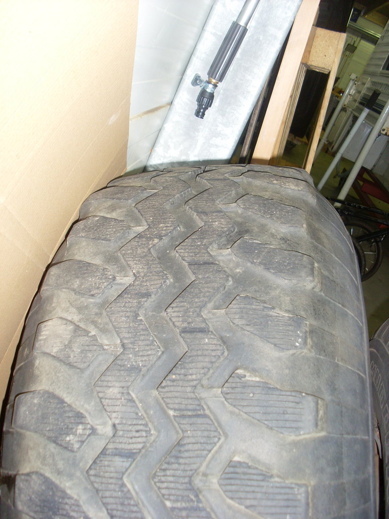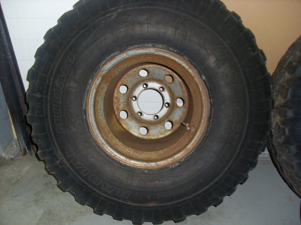 Gamli góði Mudder til sölu. Veit ekki hvað þetta telst vera mikið eftir, kannski 1/3, sést ágætlega á myndunum. Meira eftir í miðju en í köntum, míkróskorin. Halda vel lofti, pumpaði í þau í vor og eru ennþá vel hörð eftir að hafa staðið undir bíl. Felgurnar eru ljótar og þarf að blása og lakka. Frábær dekk undir létta bíla.