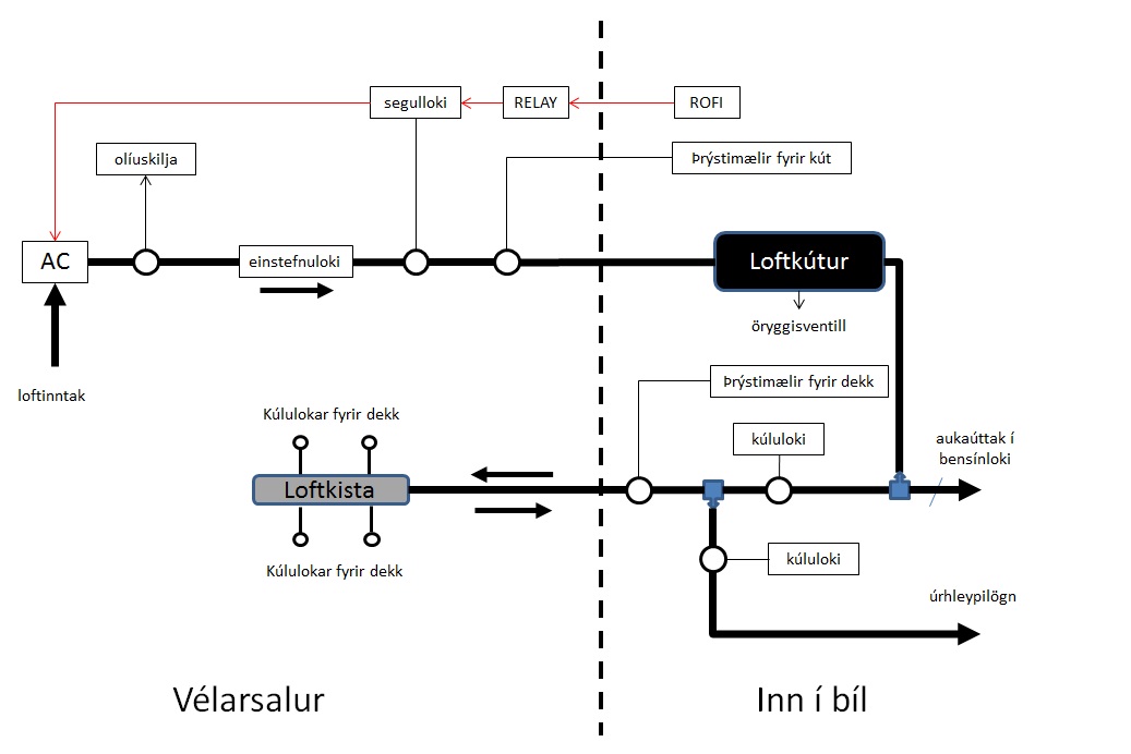 Þá er loftkista undir bíl/í húddi/í palli eins og myndin. Segulloki til að virkja hvert dekk og svo segullokar inn og út.