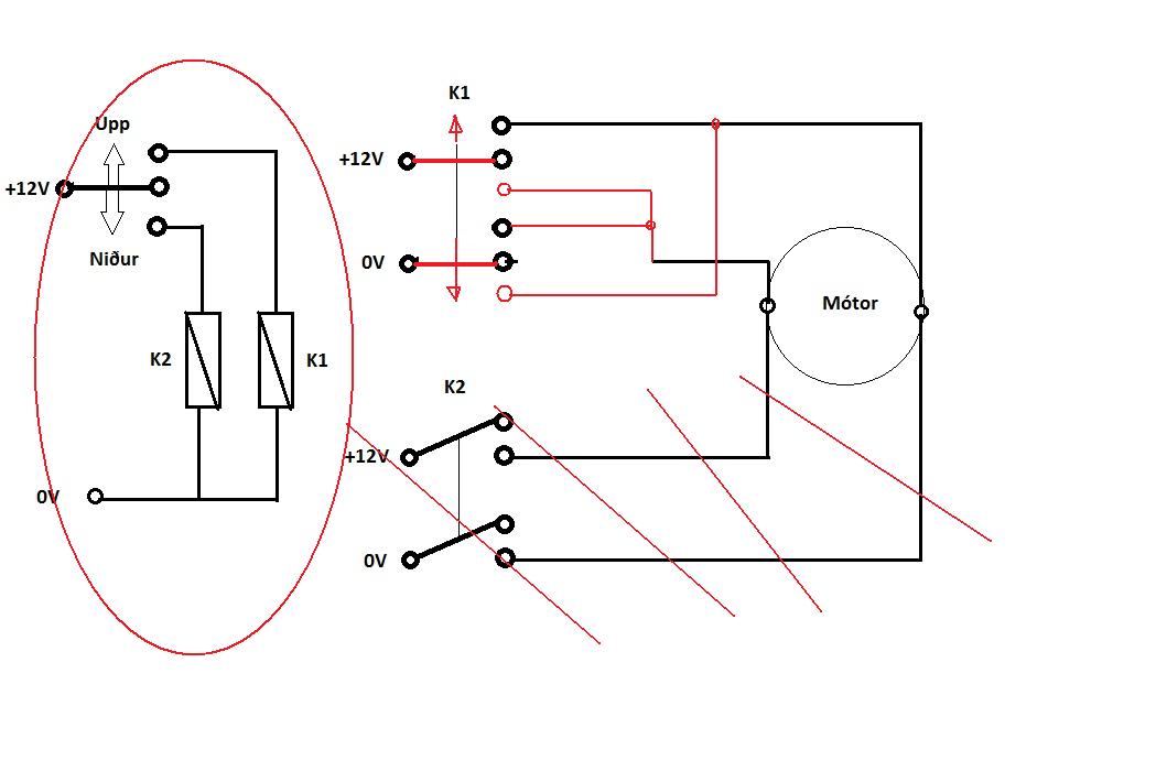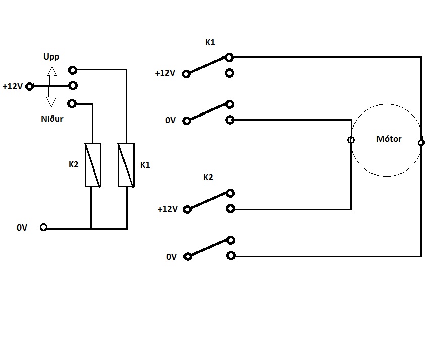 Þetta þarf ekki að vera svona flókið. Það er nóg að nota rofann ef á annað borð hann er eins og áður var lýst 2 póla víxlrofi. Ef ástæða er til að ætla að rofinn þoli ekki aflið í gegnum sig er svona græjering nauðsynleg. Hinsvegar er myndin vitlaus en svona fer rúðan aldrei upp. Ég veit að það er rétt hugsun í þessu en efsta línan á að tengjast við no hliðina á rofanum.