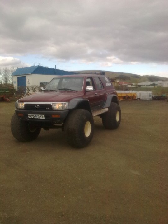 Bílinn minn er Toyota 4runner árgerð 1992 sem var bara að koma útúr skúrnum fyirir 2 vikur síðan. Planið í upphafi var að breyta honum fyrir 44" en það klikkaði einhvað þannig að það verður bara 38". Hann var settur á hásingu að framan sem kom undan Hilux og var hún breikkuð um 5cm og svo var settur stýrisgangur í LC 60 og stýrismaskína úr runner og er framhásingin eins framarlega og er í boði. Afturhásing var færð aftur 16cm og já var hann settur á gorma allan hringin. í bílnum er draumamótor allra jeppamann 3.0 v6bensín hákur sem finnst bensínið ekkert vondt á bragðið en stefnan í framtíðini er vonandi að það fari 2,4 bensín turbo ofaní hesthúsið. Dekk eru 38" GH a sumrinn og 38" mödder.