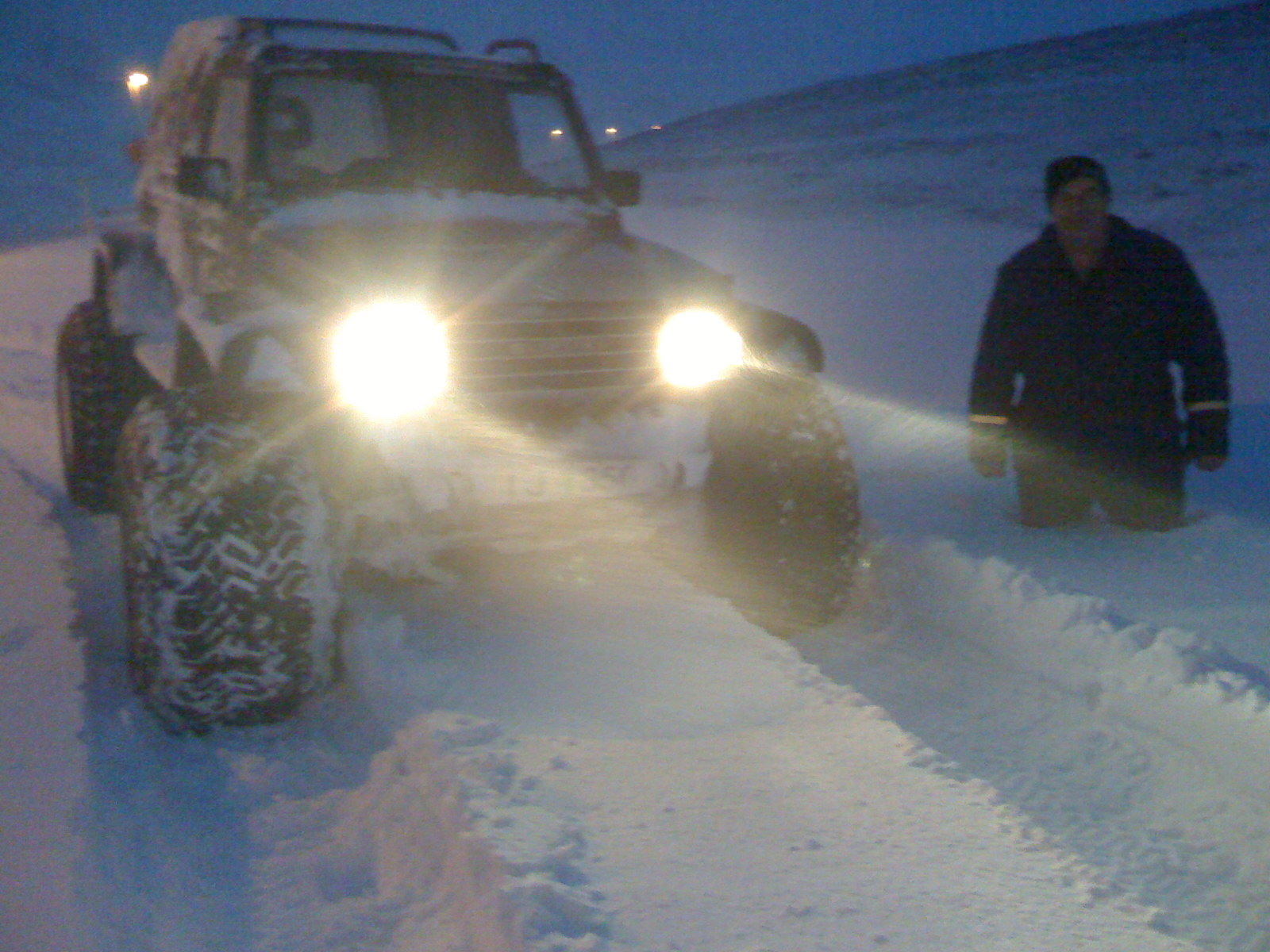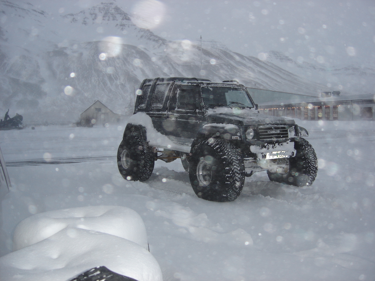 Bíllinn er þannig útbúinn að vélin er V-6 Ford 2,8 lít með fimmgíra orginal kassa og millikassa sem núna er orðinn milligír með Dana 300 aftast. Þetta véla og kassa dót eru úr Bronco ll með Motorcarft blöndung svo til nýjum engin tölva er í bílnum nema stýringin fyrir kveikjuna. Ég er búinn að parta bílinn gjörsamlega í frumeindir bæði drif og kassa og er búinn að fá aðra vél úr Bronco 1985 sem er aðeins ekinn 100.000km frá upphafi og verður hún yfirfarinn. Bíllinn er á Toyota hásingum þessum léttu og gömlu með fourlink að aftan og Range Rover að framan og stýristjakk. Læsingar eru raflásar sem búið er að breita og setja á loft tjakka og er það að virka vel. Hlutföllin eru 5:70 og demparar eru sérsmíðaðir fyrir þenna bíl og eru frá Koní. Afturhásing var færð aftur um 40 cm og framhásing fram um 10 cm og er bíllinn 284 cm á milli hjóla og ökumaður situr í miðjum bíl og síðan er 50% þungi á hvorn öxul miðað við 110 lít af bensíni sem er aftast og 25kg rafgeymi.Ég vigtaði undirvagninn með vél og öllu tilheyrandi og var hann 1000kg.Í leik á 44" Dic cepek á 1 pundi er meðal eyðsla á 1 klukkustund 4,5 lít sem er slatti búinn að mæla þetta nokkru sinnum.Þarna á myndinni er bíllinn á 44" í mjög djúpum snjó og var ég að prufa flotið ég stökk út og fór í klof. Bíllinn fer ekki á kúlu stærri bílar svo sem 44 patrol 92 með skriðgír og læsingar reyndu við þetta og sukku upp á stuðar um leið og fóru svo aðra leið nentu þessu ekki sögðu þeir