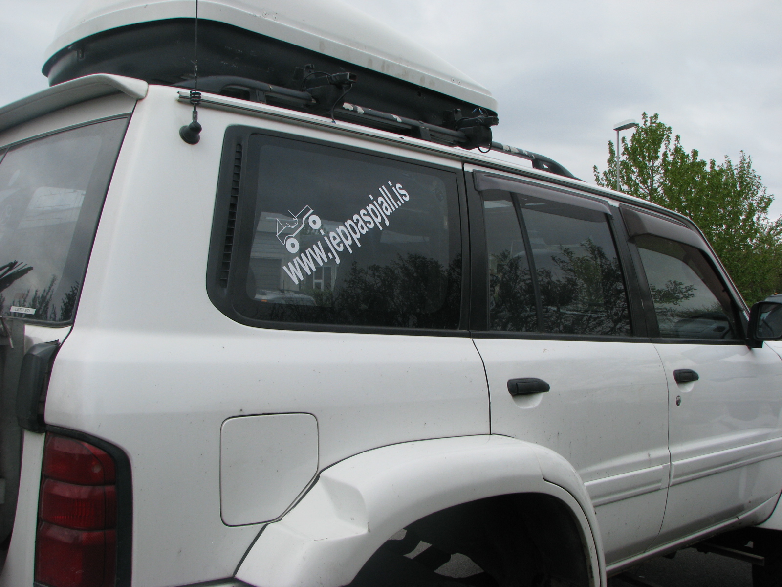 Já flott. Þá tæki ég þetta hjá þér á mánudagskvöldið og gæti byrjað að "dreyfa" þessu í bænum á þriðjudaginn. En ég tók eftir því þegar ég sá Patrolinn þinn áðan að miðinn í vinstri rúðunni hjá þér er ekki með "jeppanum" á eins og þessi í hægri rúðunni. Er einhver sérstök ástæða fyrir því, var einfaldlega ekki pláss fyrir hann þarna megin?